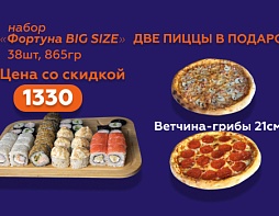 Удача сегодня на твоей стороне набор «Фортуна BIG SIZE» - 38 роллов (865 г) и ДВЕ ПИЦЦЫ В ПОДАРОК Цена со скидкой ВСЕГО 1330 ₽ В подарок: - Ветчина–грибы 21 см - Супер Пепперони 21 см ✅ТВОЙ ПРОМОКОД: 5 *Акция может закончиться в любой момент ** В одном заказе может быть неограниченное количество товаров со скидкой.