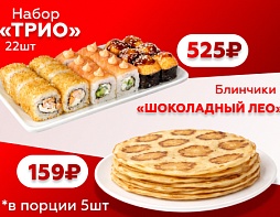 Масленичная неделя уже началась! Блинчики: «Шоколадное безумие» - 175₽ «Райское наслаждение» - 230₽ «Пеппероника» - 210₽ «Джульетта» - 210₽ «Шоколадный Лео» - 159₽ И идеальный набор для ужина на двоих: ТРИО всего за 525₽ ✅ТВОЙ ПРОМОКОД: 5 *Акция может закончиться в любой момент ** В одном заказе может быть неограниченное количество товаров со скидкой.