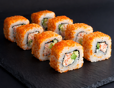 Замес краба, рис, нори, огурец, икра Масаго, имбирь, васаби, соевый соус