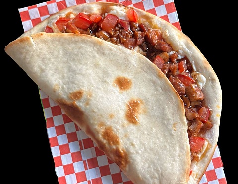 Шашлык в соусе терияки, сыр моцарелла, помидоры, соус сливочный , тесто тонкое